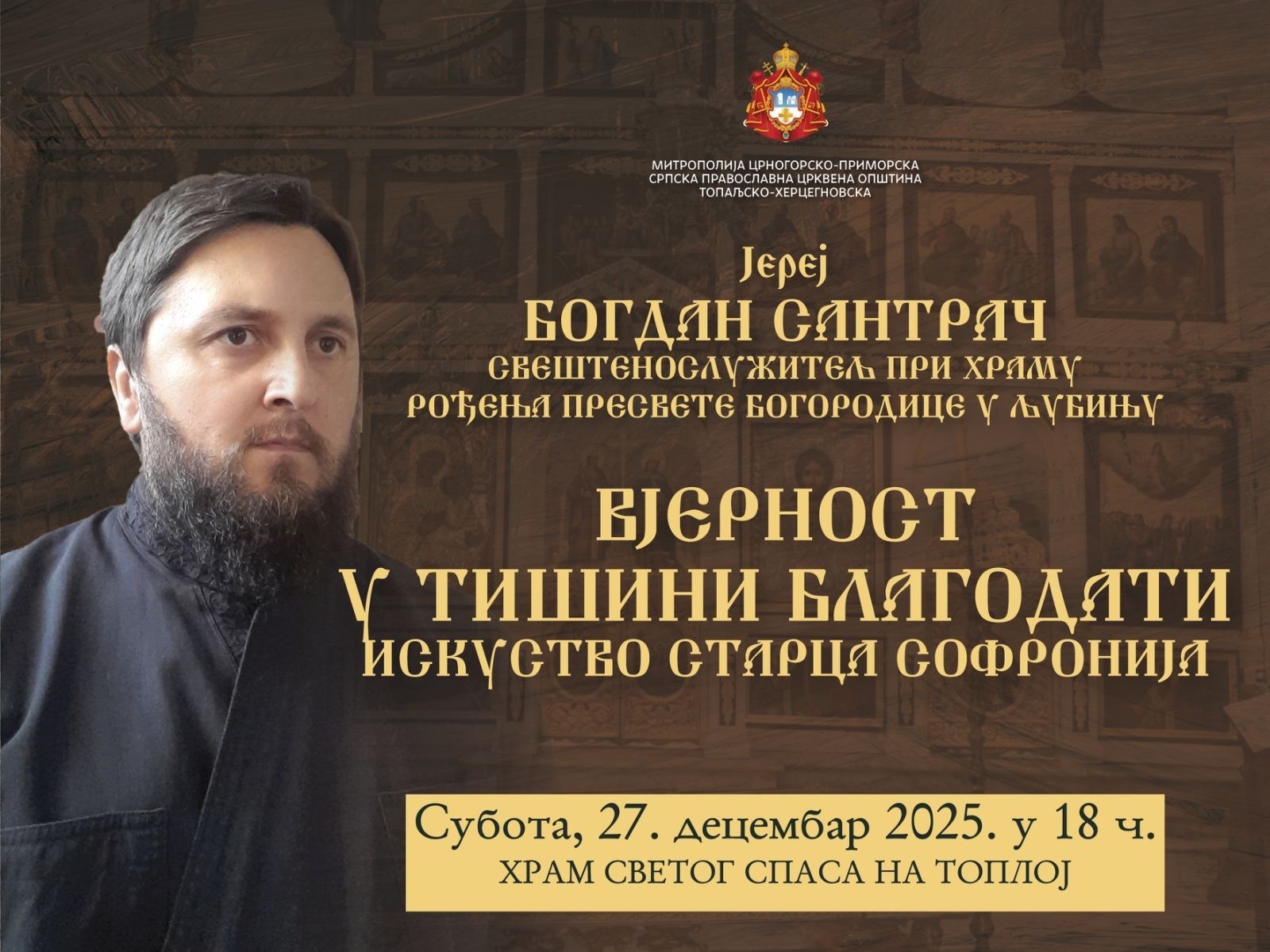 У оквиру циклуса предавања у току Божићног поста, предавање на тему "Вјерност у тишини благодати (искуство старца Софронија)“, одржаће се у суботу 27. децембра са почетком у18 часова у храму Светог Спаса на Топлој.