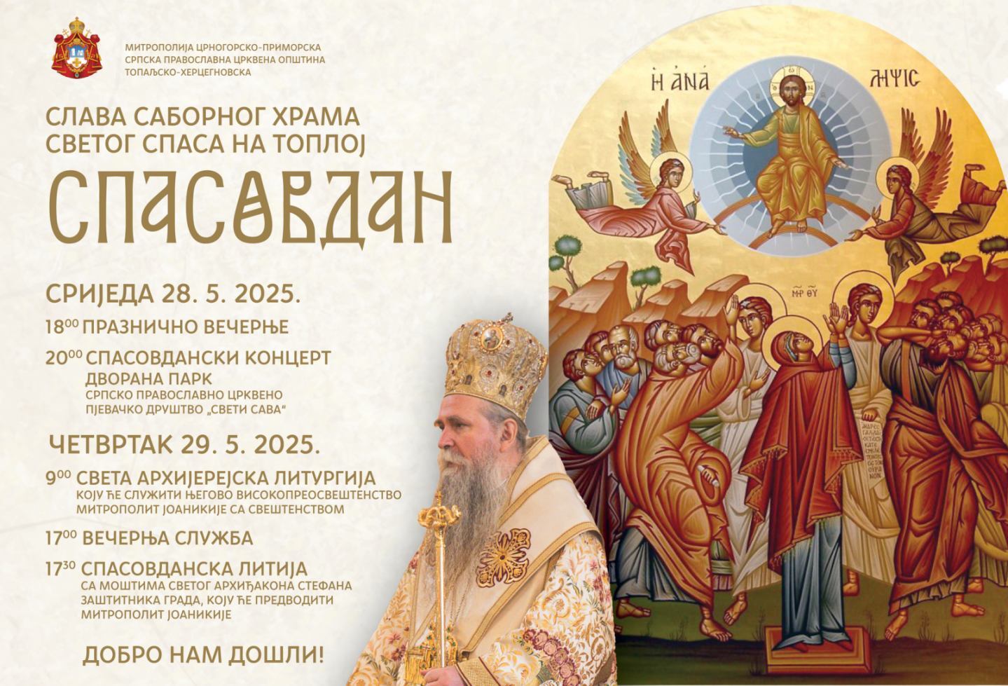 Поводом храмовне славе саборног храма Светог Спаса на Топлој, у четвртак 29. маја, Високопреосвећени митрополит Јоаникије са свештенством, служиће свету Литургију у овоме храму са почетком у 9 часова. Истога дана увече, Митрополит Јаникије ће предводити традиционалну свечану Спасовданску литију, која ће ове године ићи од храма Светог Спаса на Топлој, до храма светог архангела Михаила у Старом граду, након чега ће шеталиштем кренути у повратак поново ка саборном храму. Улицама нашег града, том приликом биће ношена честица часних моштију светог архиђакона Стефана, небеског покровитеља и заштитника града Херцег Новог.