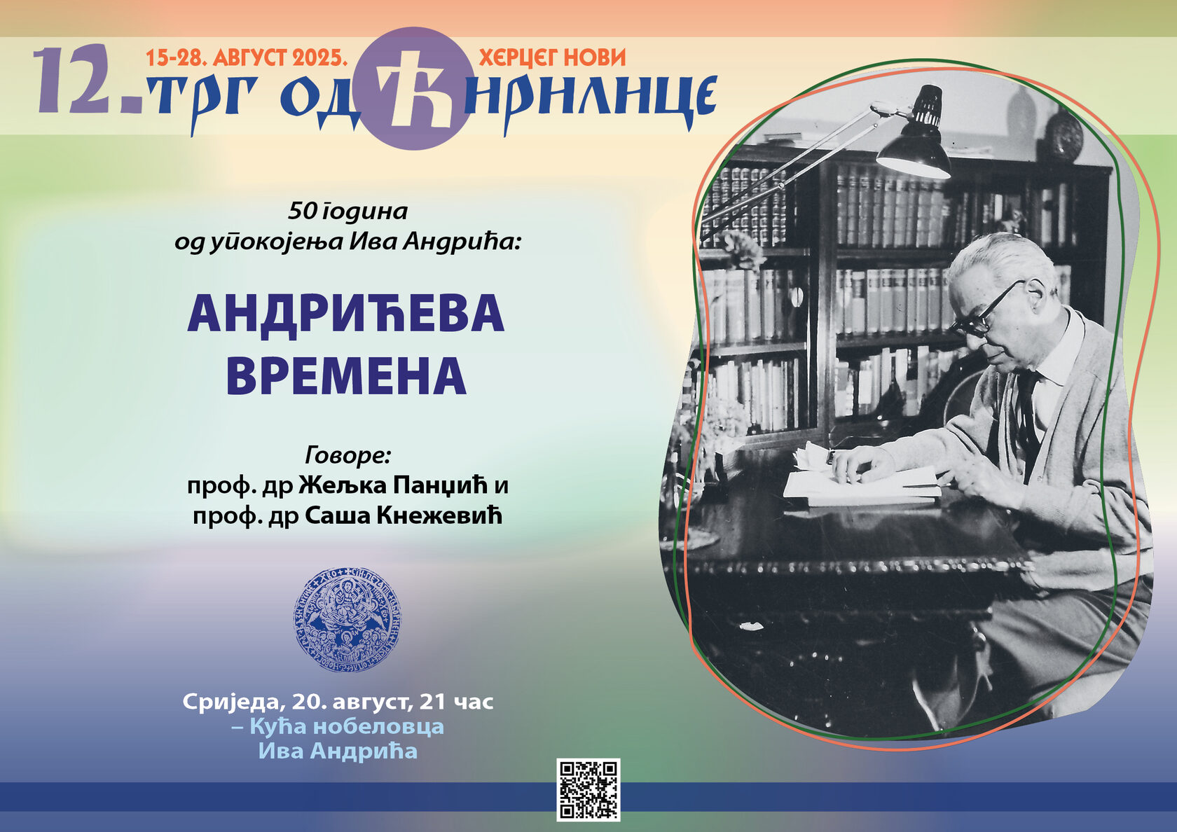 У организацији Српске православне црквене општине топаљско-херцегновске, у оквиру 12. Трга од ћирилице, вечерас у сриједу 20. августа, кући нобеловца Ива Андрића у Херцег Новом са почетком у 21 час, одржаће се програм посвећен Иву Андрићу поводом 50 година од његовог упокојења.