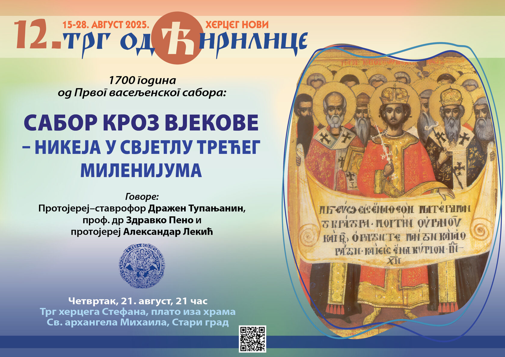 У организацији Српске православне црквене општине топаљско-херцегновске, у оквиру 12. Трга од ћирилице, вечерас у четвртак 21. августа, на Тргу Херцега Стефана на платоу иза храма светог Архангела Михаила са почетком у 21 час (у случају кише у парохијској гостопримници поред храма), одржаће се програм под називом "Сабор кроз вјекове - Никеја у свијетлу трећег миленијума.
