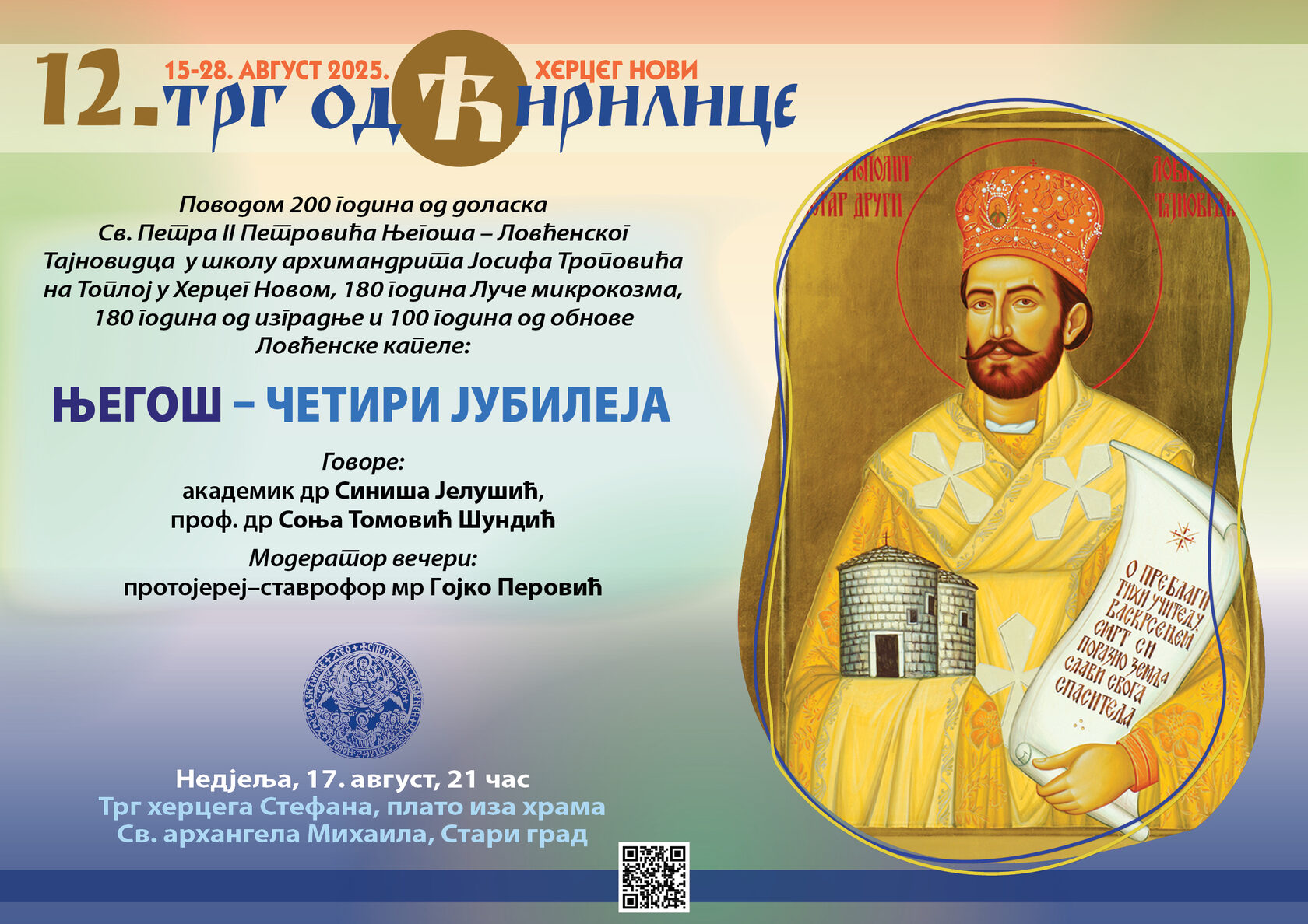 У организацији Српске православне црквене општине топаљско-херцегновске, у оквиру 12. Трга од ћирилице, вечерас у недјељу 17. августа, на Тргу Херцега Стефана у 21 час, одржаће се програм посвећен светом Петру II Петровићу Његошу, ловћенском тајновидцу, поводом четири велика јубилеја, 200 година од доласка у школу Јосифа Троповића на Топлој, 180 година луче микрокозма, 180 година од изградње и 100 година од обнове његове завјетне капеле на Ловћену.