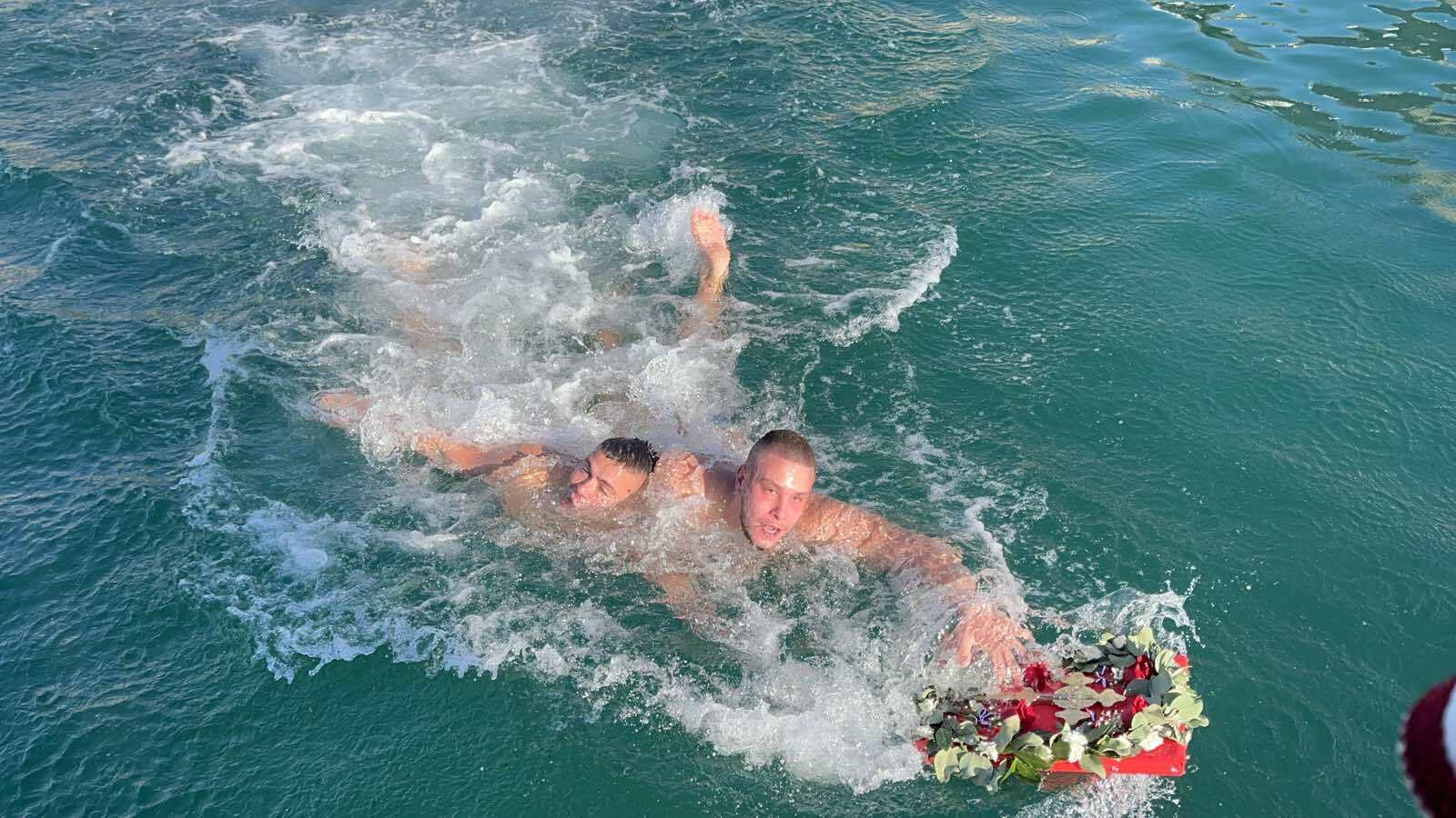 Приликом доласка у градску луку, најприје је освештано море, након чега су пливачи позвани да уђу у освећене морске воде и припреме се за пливање за часним Крстом. Док је отац Обрен Јовановић пловио ка мјесту гдје ће положити часни Крст, свештеници са копна су благосиљали пливаче, као и све присутне, призивајући благослов божији житељима овог града.