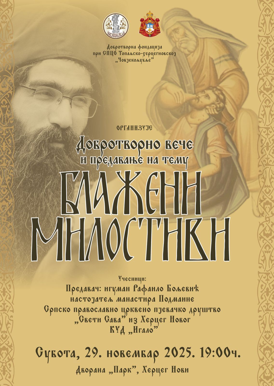 У оквиру ове вечери, игуман манастира Подмаине јеромонах Рафаило Бољевић одржаће предавање на тему "Блажени милостиви". Вече ће најприје отворити пјесмом и игром Српско православно црквено пјевачко друштво Свети Сава из Херцег Новог и КУД "Игало".