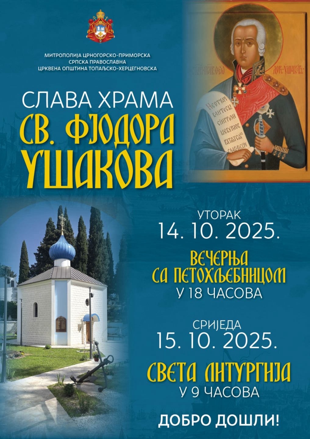 Позивамо вијерни народ на свечану прославу храмовне славе цркве Светог Фјодора Ушакова на Дубрави која ће почети празничном вечерњом службом у уторак 14. октобра у18 часова.